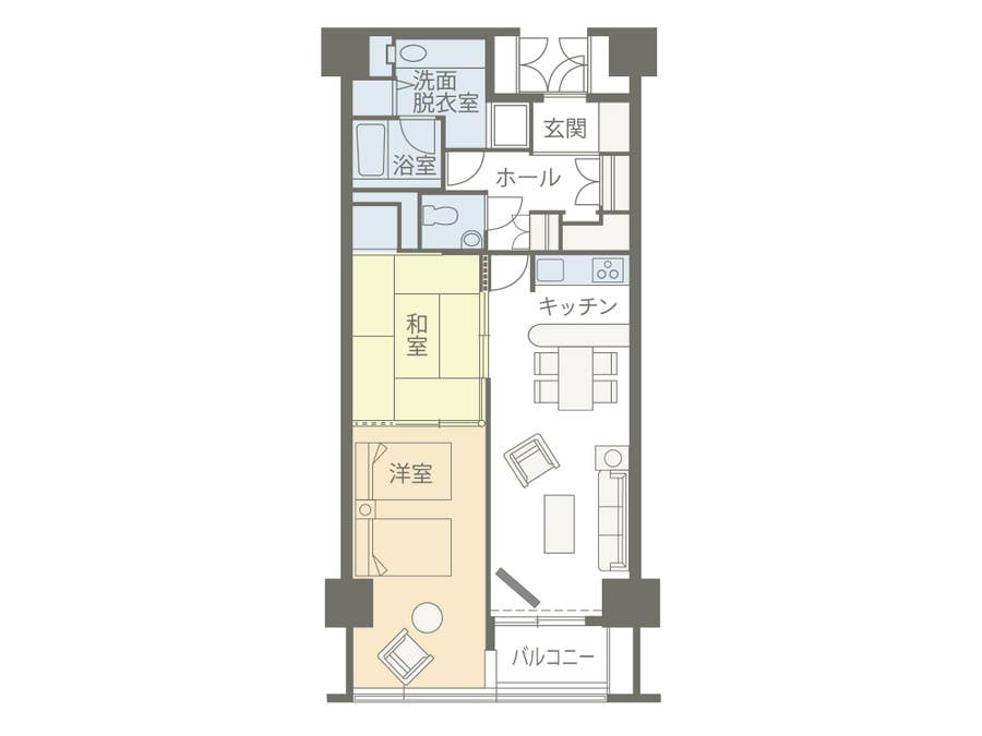 The furniture has been updated with wood-like furniture that gives off a warm feeling of wood, and fabrics in soft earth tones have been used, transforming the space into a more luxurious one.