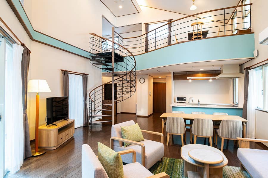 Natural fabrics are used to evoke the gentleness of nature, and the counter and spiral staircase walls are accented with a refreshing light blue color.