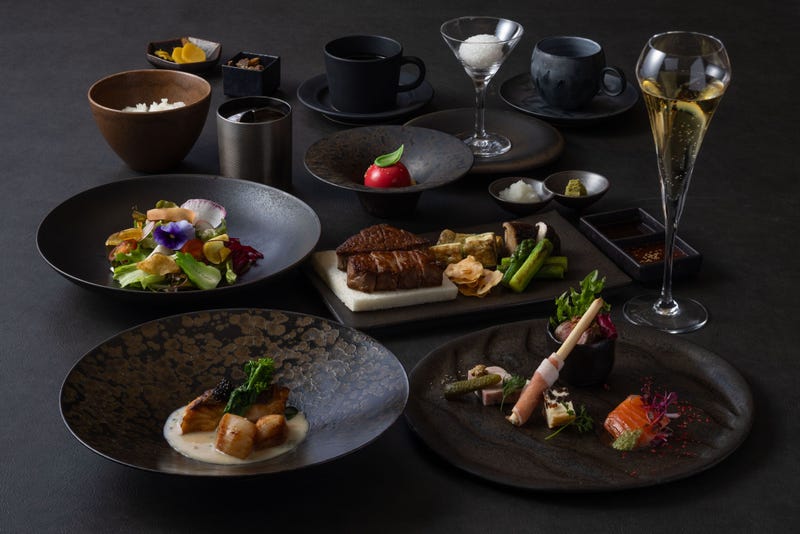 In addition, the plates used to enhance the food have also been renewed to coincide with the renovation. The dark-toned dishes, inspired by the theme of "earth," bring out the chef's skill and the appeal of the ingredients in a deeper and more elegant way. The freshly grilled Miyazaki beef and live abalone dishes exude a presence that is almost like a work of art.