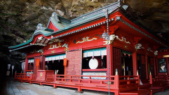 This unusual shrine has a vibrant vermilion-painted main hall enshrined in a cave at the tip of Cape Udozaki, which juts out into the Pacific Ocean. It is famous for its "lucky ball," which is said to grant wishes if you enter it into the square-shaped rock formation known as Kameishi.