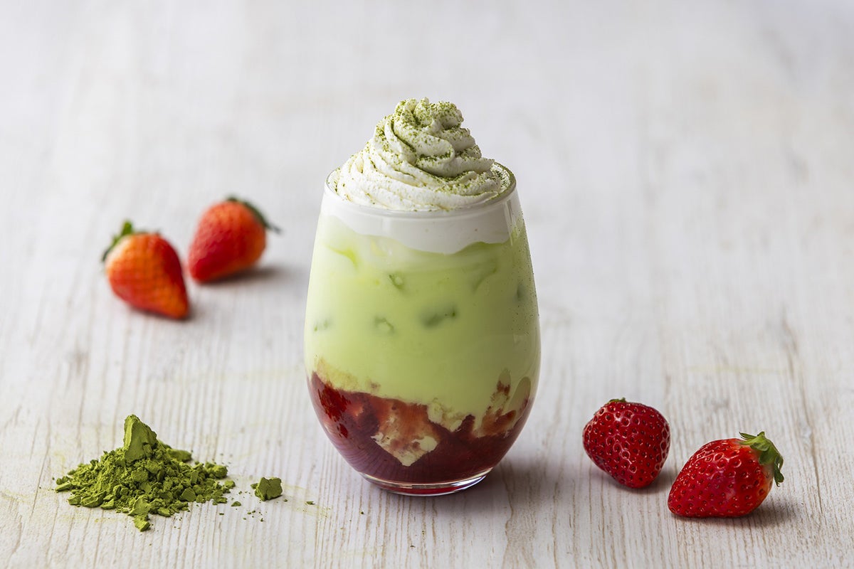 A gently sweet green tea latte is enhanced with sweet and tart homemade strawberry jam. Topped with whipped cream and green tea powder, it has a smooth and light flavor.