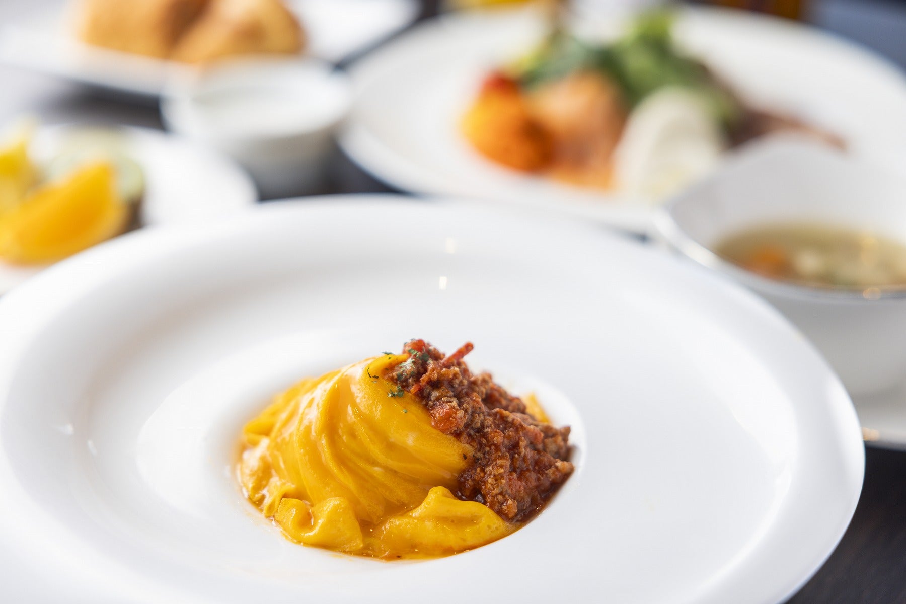Enjoying breakfast while gazing out at the majestic Pacific Ocean below is the epitome of luxury. For your main egg dish, made with eggs from Miyazaki Prefecture, choose from a plain omelet, a dressed omelet with Sadowara eggplant, or a galette with Miyazaki uncured ham. Salads, cheeses, soups, and more are available in a half-buffet style. In the early morning, you may encounter the mystical "Morning Sun Road," where the morning sun illuminates the ocean. Be sure to experience this special morning.