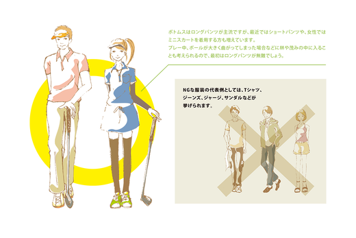 男性・女性ともに襟付きのトップスとパンツルック、ゴルフシューズ着用が基本です。